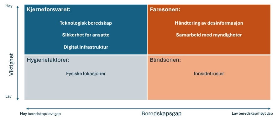 Kartleggingen viser en tydelig sammenheng mellom ansett viktighet og hvor forberedt mediene er. Mediehusene jobber målrettet, og beredskapen er høyest rundt «tradisjonelle» beredskapsområder som sikkerhet for ansatte og journalister, teknologisk beredskap og digital infrastruktur.