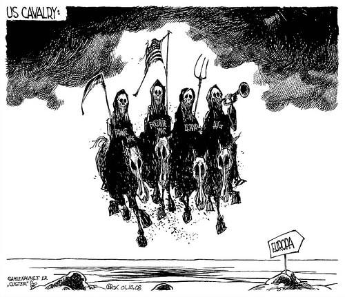Hallvard Skauge er tildelt pris for Årets Avistegning for 2007-2008. Tegningen «US CAVALRY», presentert i Klassekampen 4. oktober 2008.